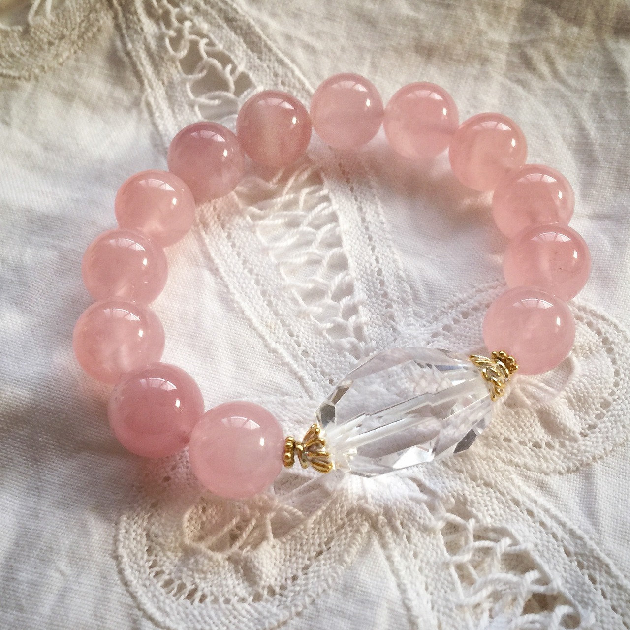 マダガスカルローズクォーツとラフカット水晶のブレスレット