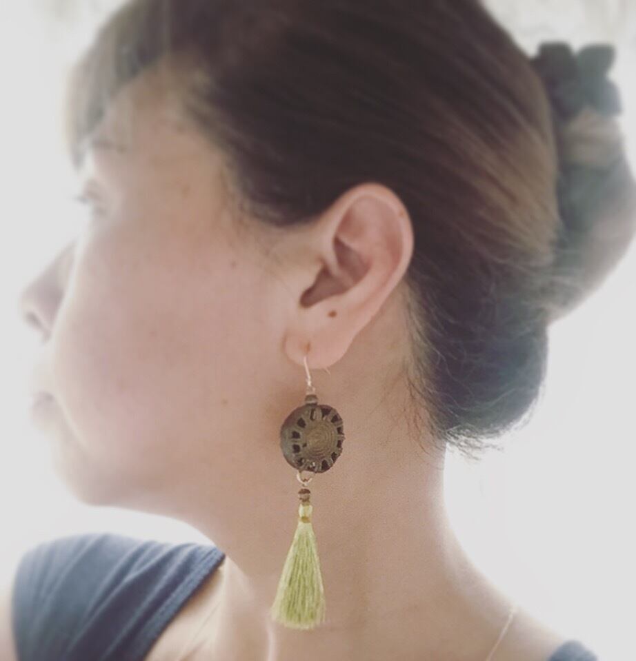 原始的な鋳造方法で形づくられたインド〜アフリカ間のオールドパーツにゴールドのタッセルを組み合わせて。