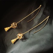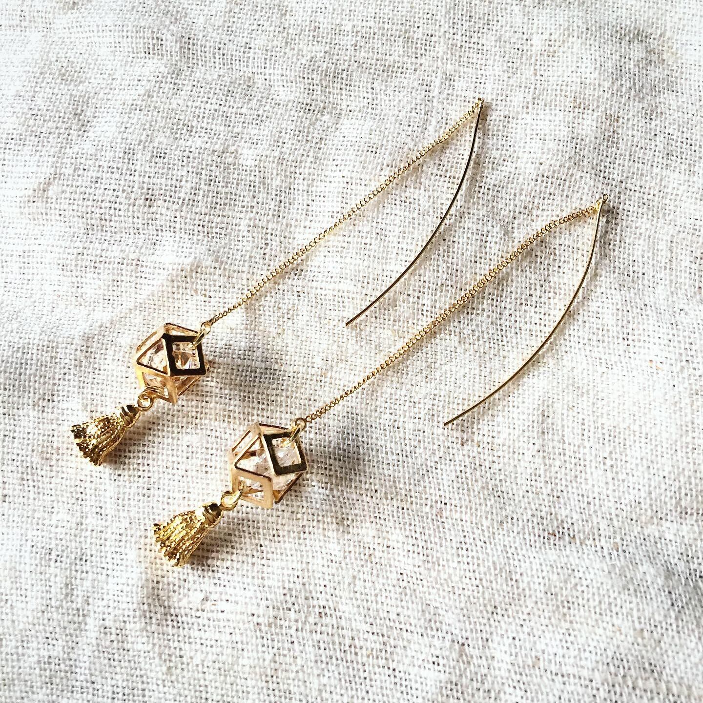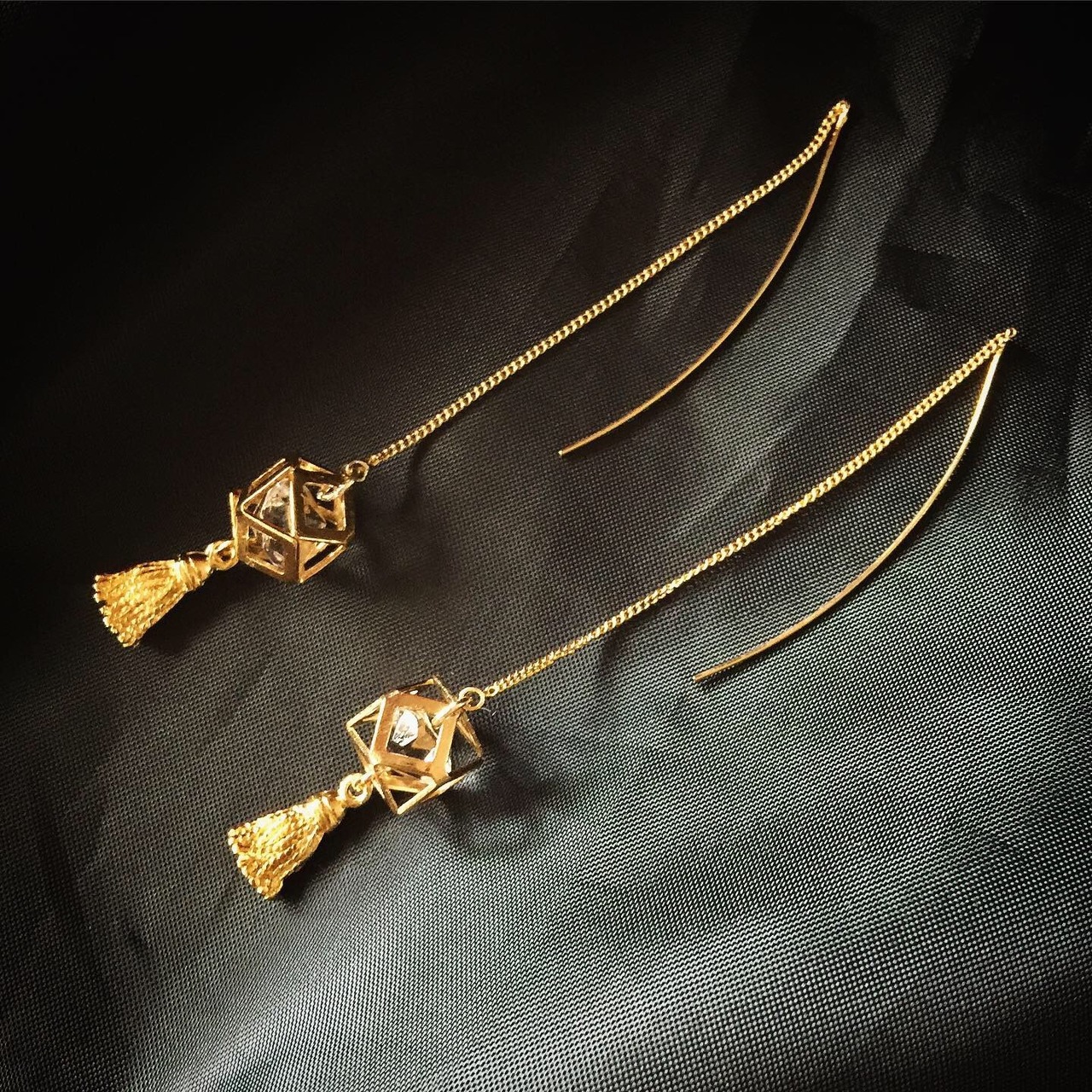 小さな小さな幾何学は"フラワーオブライフ"ともいわれるベクトル平衡体。内部に小さなジルコニアがきらめきます。小さなタッセルはメタル製のチャームです。