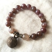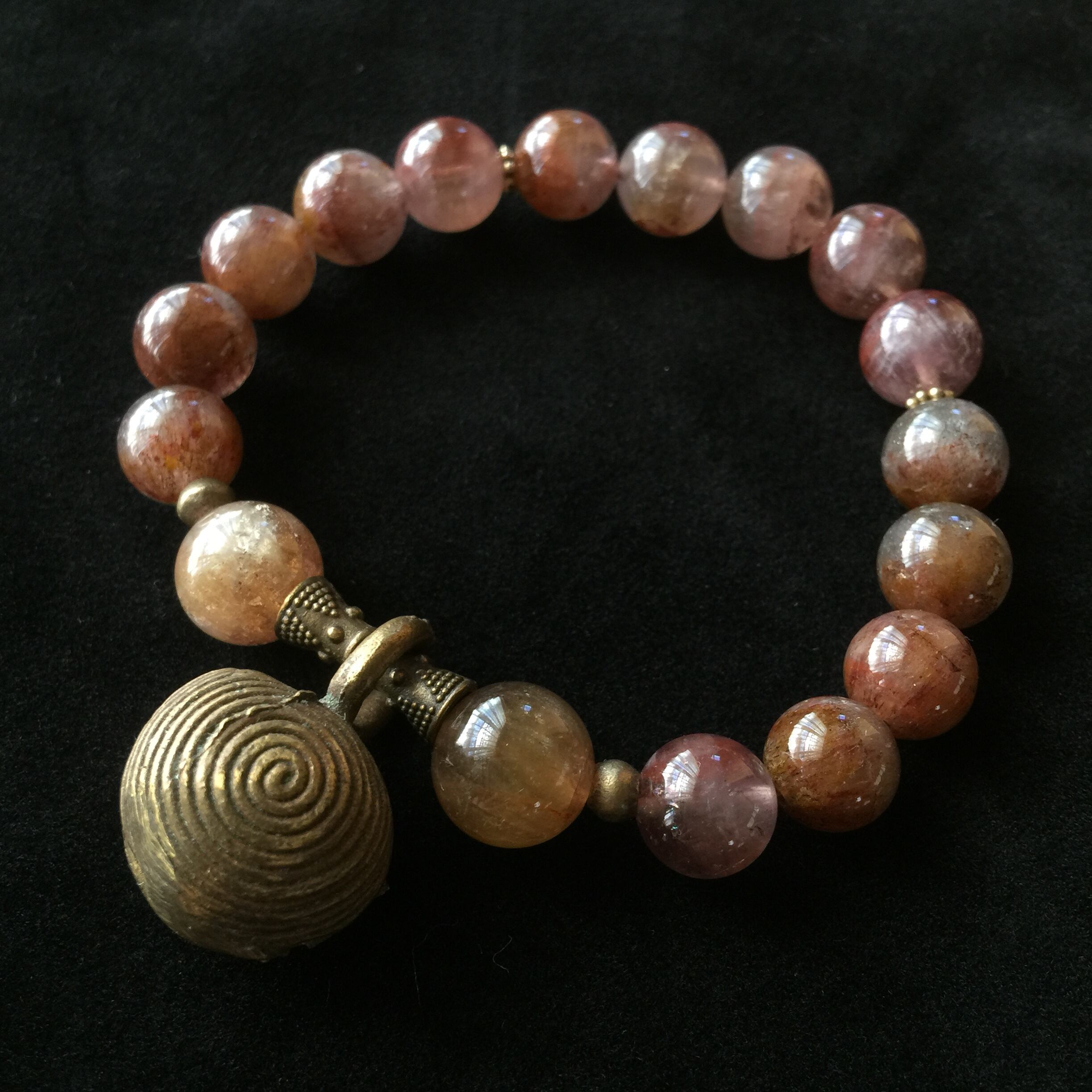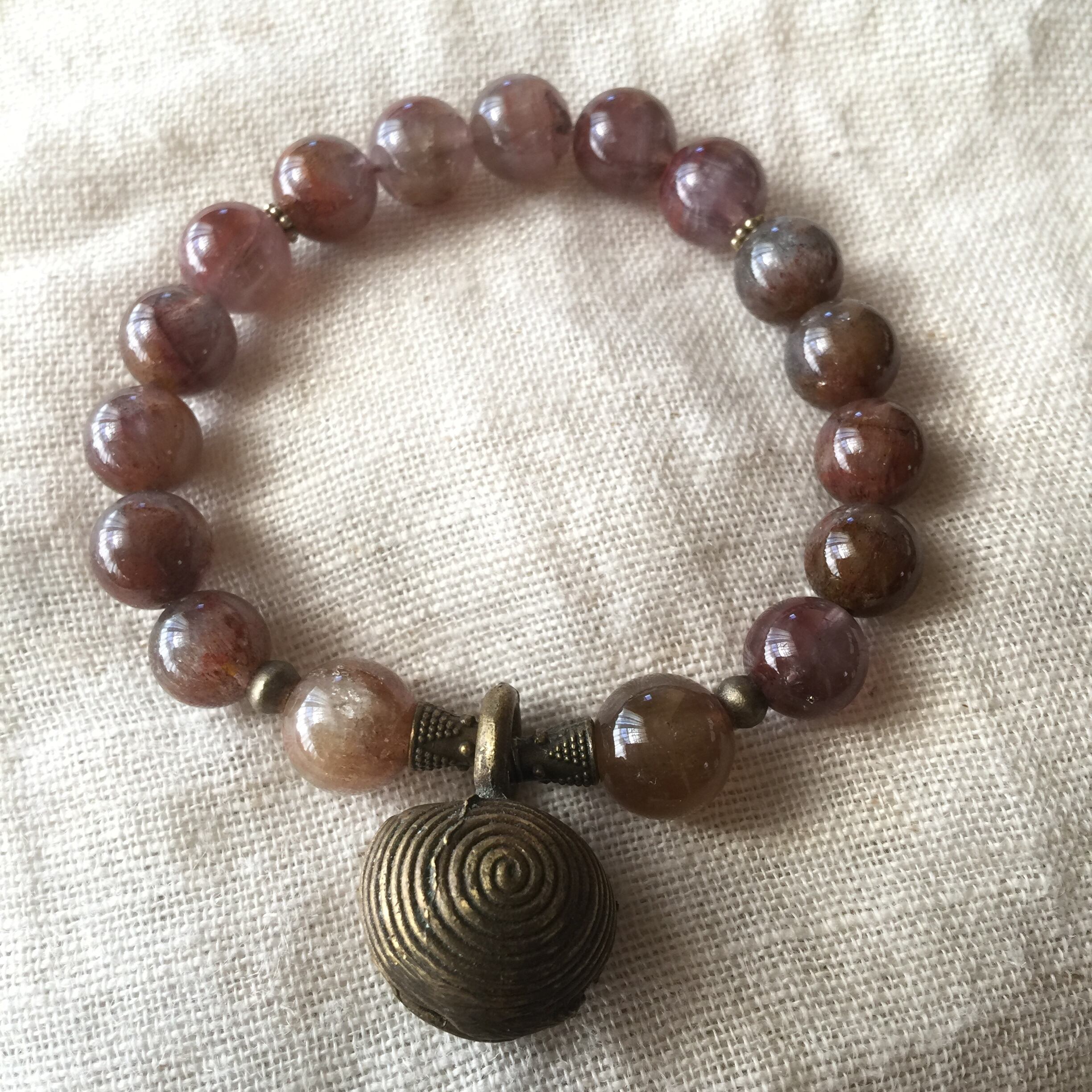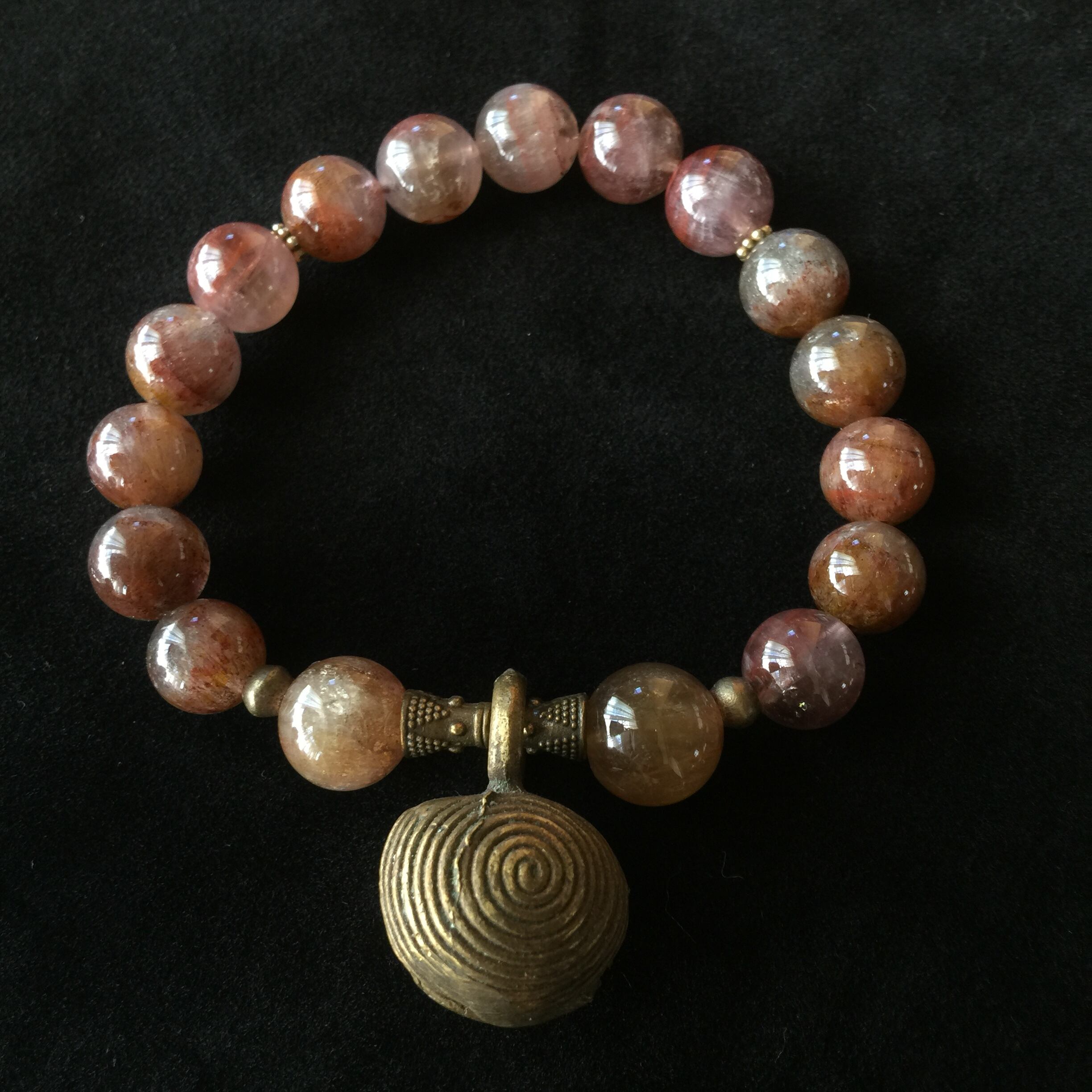渦巻き模様が特徴的なドゴン族の真鍮製の鈴に土着的な雰囲気のIXカラーアメジスト(オーラライト)を合わせました。