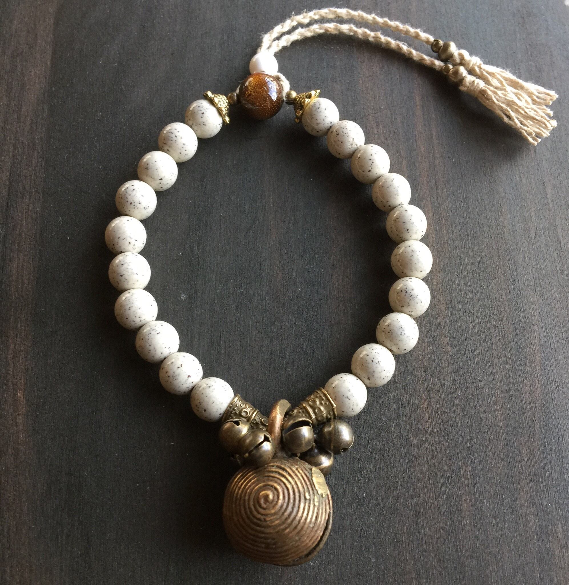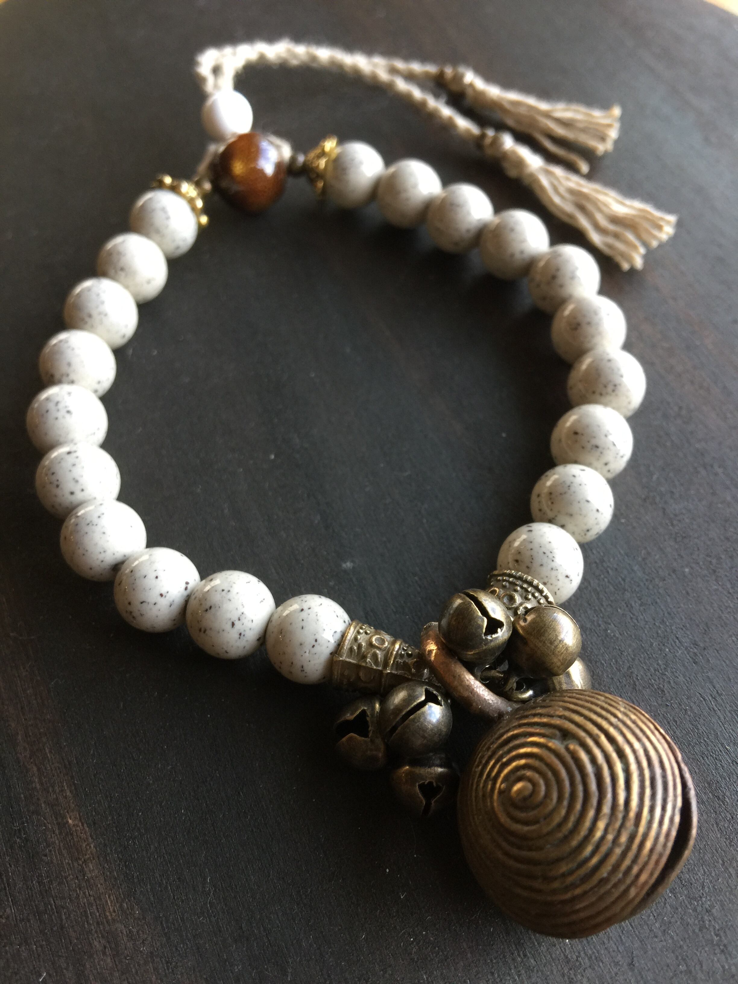 入手したものの長らくインスピレーションがわかずストックしたままだった北投石の横に最近入手したドゴン族の伝統技法による素朴な真鍮製の鈴を意識せず置いていたところ、とても響き合っているのに気付き、にわかにシャーマンの呪具そのもののようなブレスレットが完成しました。 ドゴン族はシリウスからの創世神話で知られるアフリカ・マリ共和国の部族です。