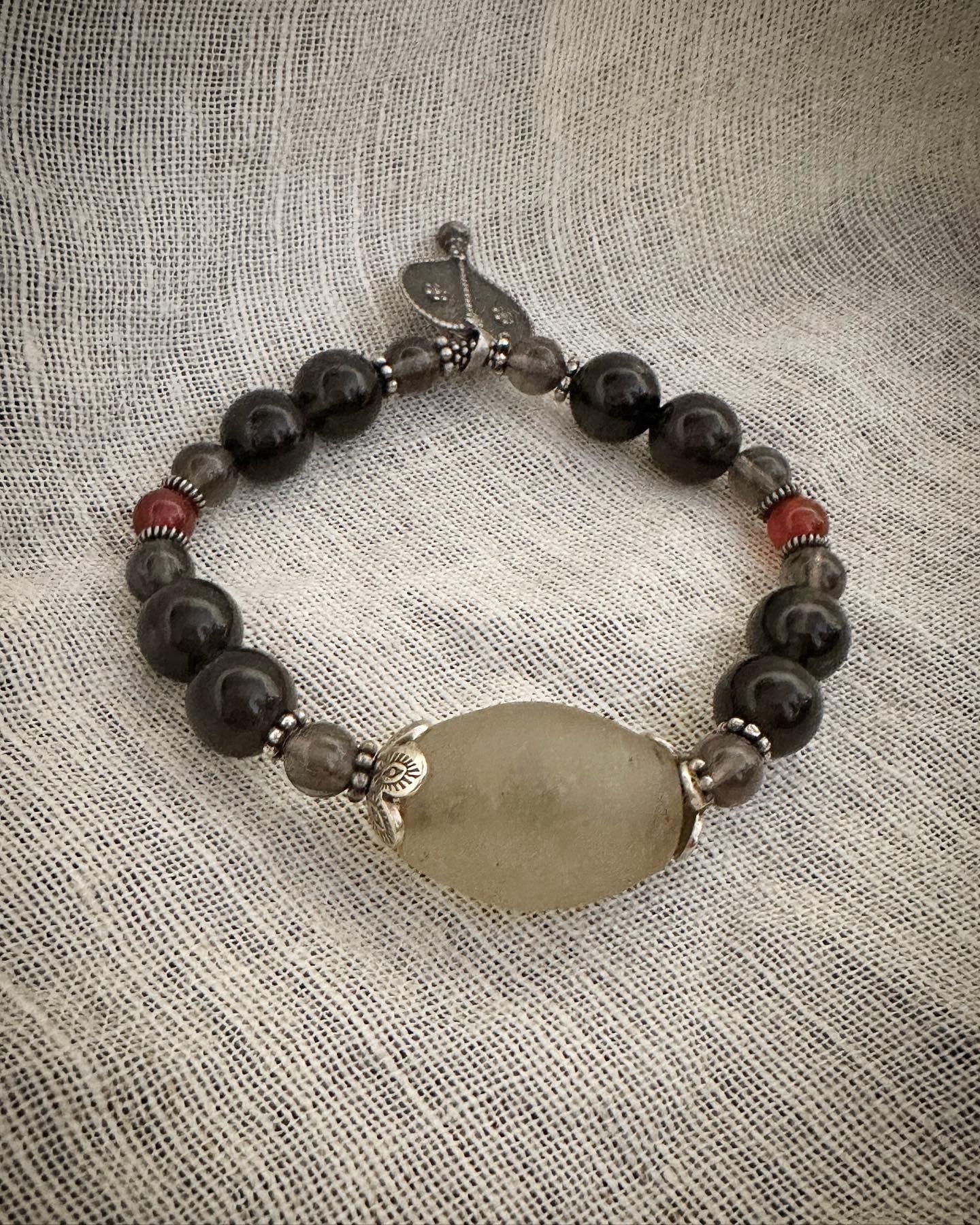 カーネリアンのわずかな赤とあいまってさりげなくも存在感のあるシャーマンの呪具のような雰囲気のあるブレスレットです。